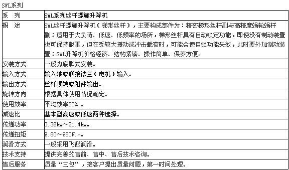 SWL系列蝸輪絲桿升降機是一種基礎起重部件,符合JB/T8809—1998(原JB/ZQ4391—86)標準。該產品可廣泛用于機械、冶金、建筑、化工、醫療、文化衛生等各個行業。承載能力2.5—120T。具有結構緊湊、體積小、重量輕、動力源廣泛、噪音小、安裝方便、使用靈活、功能多、配套形式多、可靠性高、使用壽命長等優點。具有提升、降落、推進、翻轉等功能,可以單臺或組合使用。能按一定程序準確地控制調整提升或推進的高度,可以用電動機或其它動力直接帶動,也可以手動。最高輸入轉速1500r/min,最大提升速度2.7m/min。有不同的結構型式和裝配方式,提升高度按用戶的要求制造。該裝置可以自鎖。